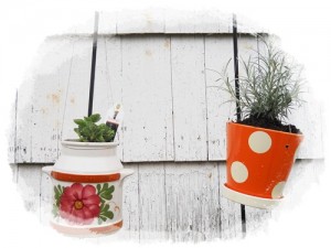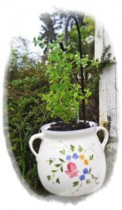 Since I finished a writing project today, I earned a few hours to work in the yard! Hubby and I filled the raised garden boxes with soil and then shopped for veggies and herbs. We also shopped for planters for our herbs, and found these lovely pots at a thrift store for only a couple bucks each. Hubby drilled drainage holes, and strung the wire. A few garden hooks, and Ta-Da!